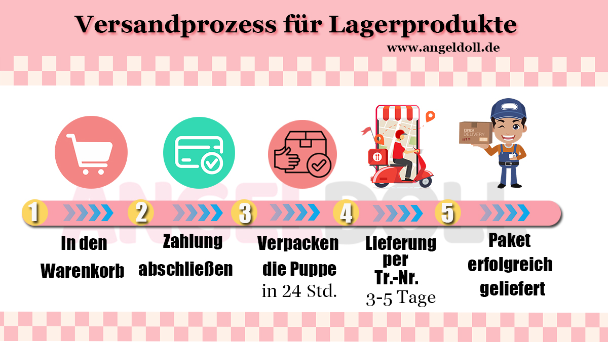 Sobald Sie Ihre Bestellung aufgegeben haben und unsere Finanzabteilung Ihre Zahlung erhalten hat, benachrichtigen wir umgehend das Lager, um den Versand für Sie vorzubereiten. Befindet sich das Lager des von Ihnen bestellten Puppenmodells in Polen, dauert die Lieferung in der Regel 3–5 Tage. Bei einem Lagerstandort in Deutschland kann die Lieferung sogar innerhalb eines Tages bei Ihnen eintreffen.